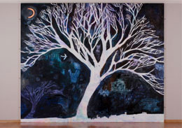 2008年3月23日、ベルナール・ビュフェ美術館は、柿の木プロジェクトに共感し、2本の柿の苗を譲り受け、子どもたちのメッセージを詰めたタイムカプセルとともに植樹しました。そしてふたつの作品が生み出されました。ひとつは《生命の樹》。画家の持塚三樹氏が描いた『昼の樹』と『夜の樹』を、10年間をかけ、子どもたちがさまざまなワークショップでつくった葉っぱで飾っていく作品です。2018年には2008年の参加者をわかるかぎり招いてタイムカプセルを掘り出し、『生命の樹』を完成させて10年間を振り返ることができました。『生命の樹』はいまもこども美術館でメッセージを伝え続けています。