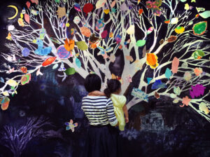 持塚三樹さんが描いた《生命の樹》。1000人の子どもたちが10年かけて飾っていく -