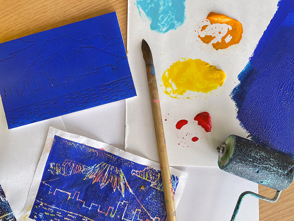 このワークショップでは、かんたんにできる手法で、カラフルな版画づくりを体験します。