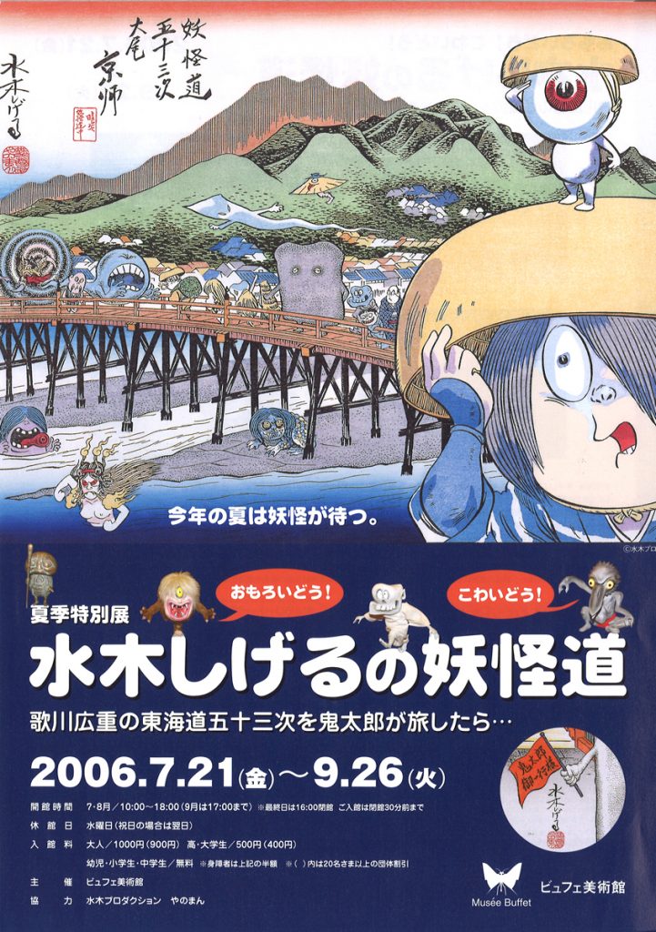 江戸時代は今よりもっと妖怪たちが活躍していた時代…そんな江戸時代の浮世絵に描かれている東海道五十三次を妖怪たちに旅させる…広重作品と水木しげる作品を楽しむ展覧会。