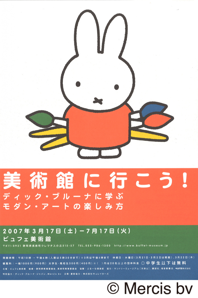 オランダを代表する絵本作家・グラフィックデザイナーであるディック・ブルーナの生み出した絵本の主人公「ミッフィー(うさこちゃん)」。1997年に出版されたブルーナの絵本『うさこちゃん びじゅつかんへいく』をガイドに、モダンアートからコンテンポラリーアートまで、愉しくわかりやすく紹介する展覧会。